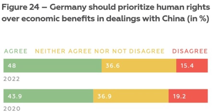 Respondents advocate a more principled China policy wherever this is possible. Human rights are considered a priority over economic interests. The polls show robust support for the reduction of dependencies, an exclusion of Chinese technology from critical infrastructure, and the adoption of the Zeitenwende paradigm in dealings with China. However, concerns remain whether Germany can afford to economically disentangle itself from Russia and China at the same time. The public opinion is divided on whether Germany should provide economic assistance to Taiwan in case of a war.