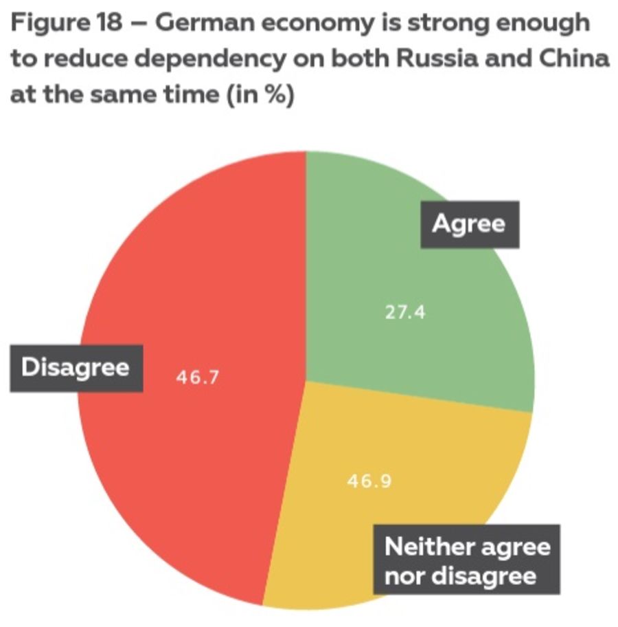 Almost half of Germans surveyed are concerned the country’s economy is not strong enough to reduce dependencies on Russia and China at the same time.